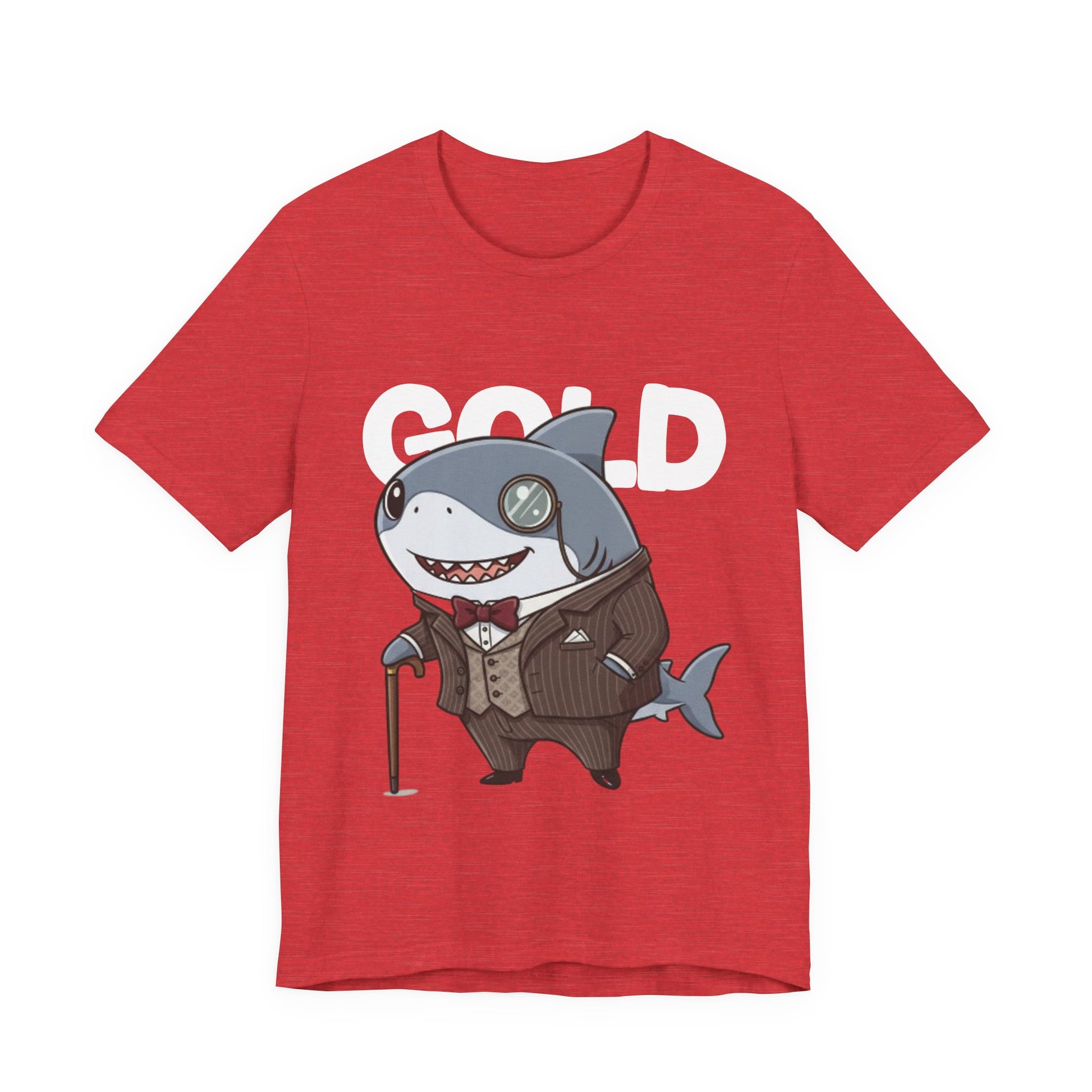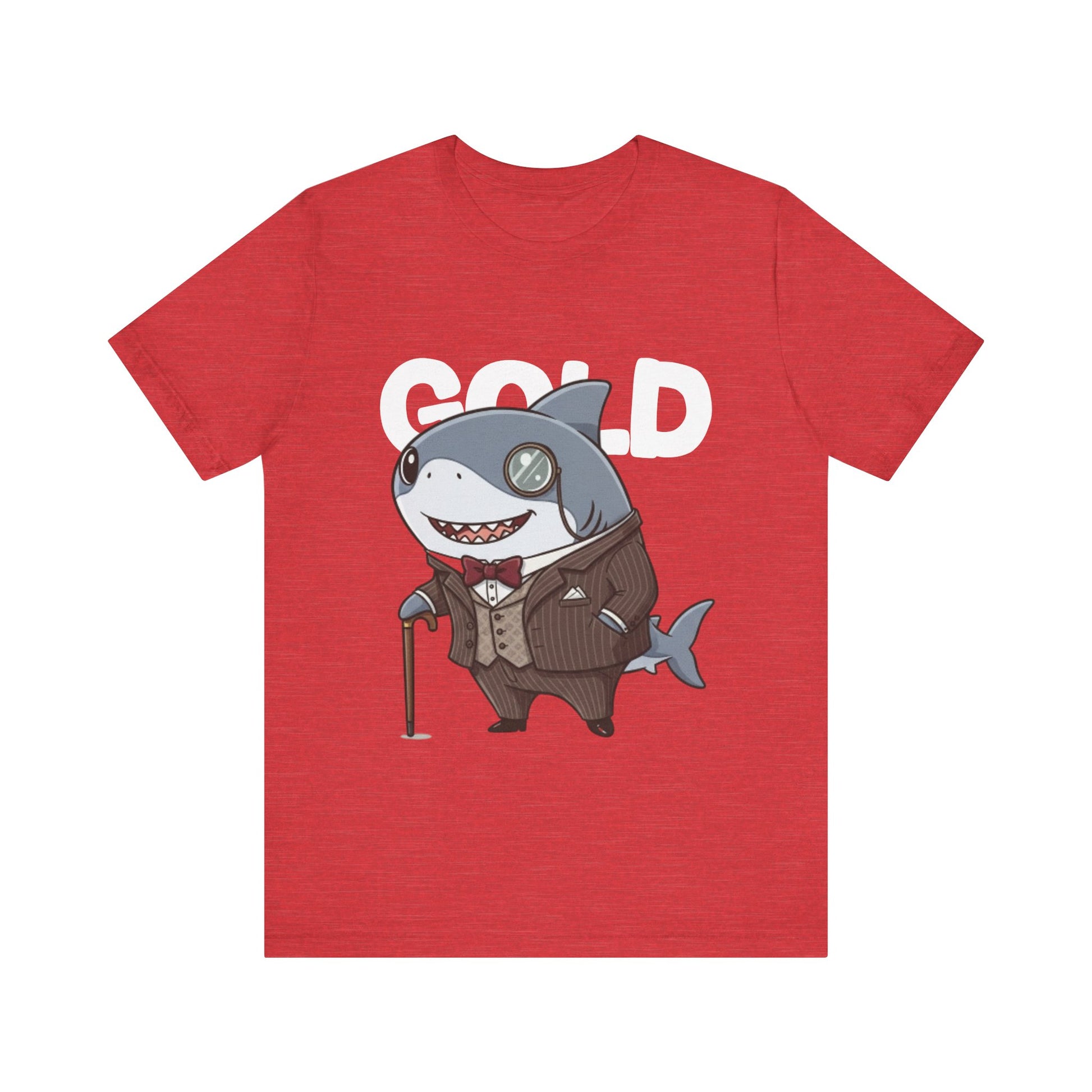 Dive into distinguished style with this unique T-shirt featuring our charming shark, dressed to the nines in a classic vintage suit, complete with a monocle and cane. Perfect for those who appreciate a touch of old-world class and a dash of playful sophistication. Make a bold statement that says you're not just stylish, you're "GOLD."